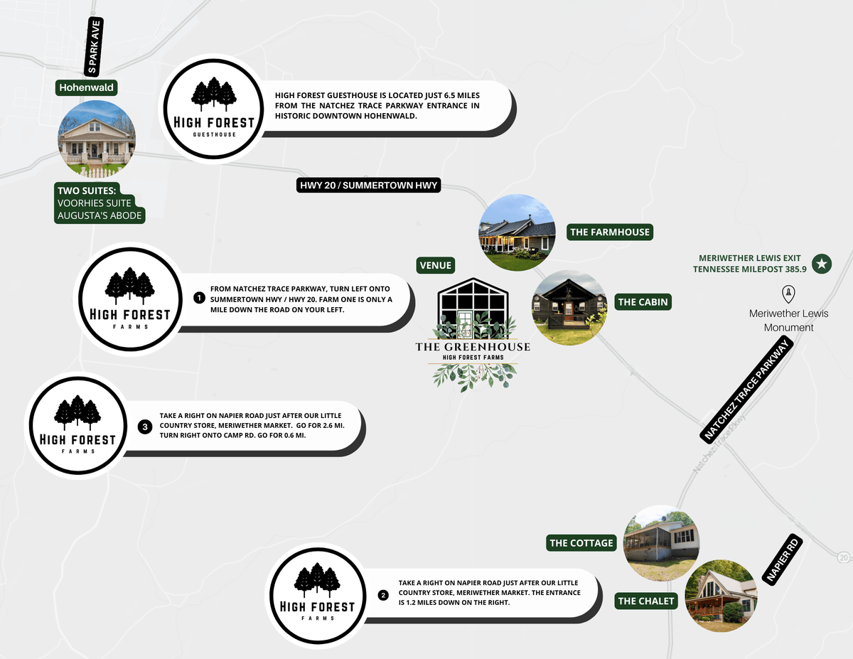 High Forest Farms is located just off the Natchez Trace Parkway exit Meriwether Lewis at mile post 385.9